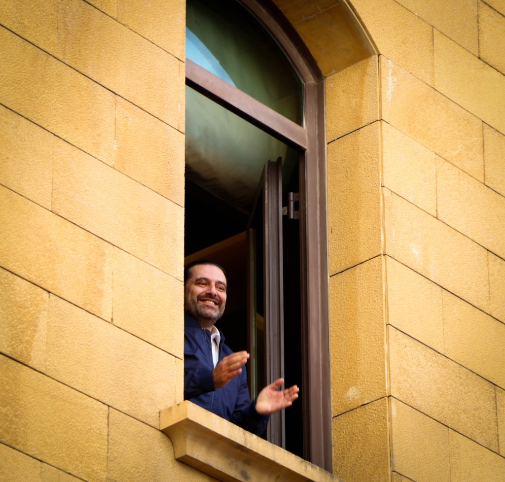 Saad Hariri waves from his balcony in Beirut (MEE/Philippe Pernot)