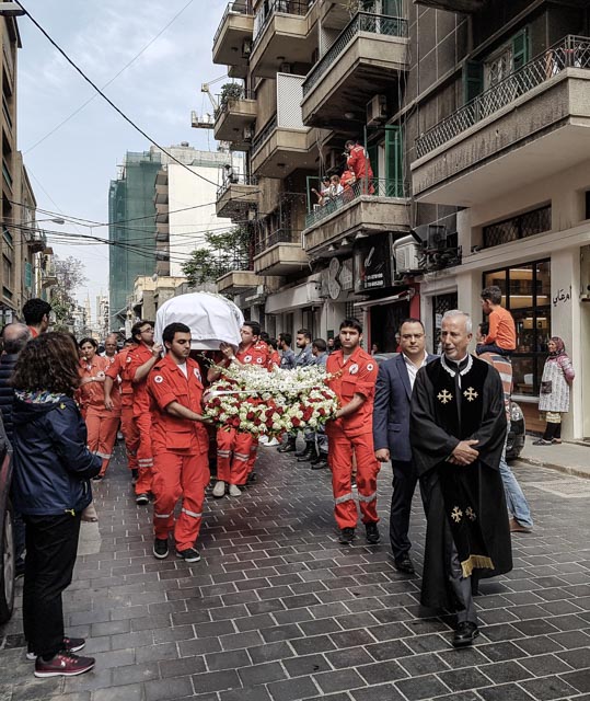 Les ambulances venues chercher le corps du défunt à l’hôpital de l’Université américaine de Beyrouth à 9h ont suivi un tracé symbolique. Passant d’abord par le siège de la Croix-Rouge libanaise (CRL), rue Spears, elles ont marqué un arrêt devant l’ancien centre CRL de Gemmayzé, où Hanna Lahoud avait été volontaire pendant une décennie. Là, ses camarades des équipes secouristes de la Croix-Rouge ont porté son cercueil jusqu’à l’actuel centre de la rue Gouraud, suivis de sa famille endeuillée. Des passants et des habitants du quartier ont également souhaité rendre un dernier hommage au jeune volontaire, jetant du riz et des pétales de fleurs sur le cercueil. Le cortège funéraire était digne de celui d’un héros national, encadré par une escorte policière et une quinzaine d’ambulances dont les sirènes couvraient à peine les cris déchirants de la famille du défunt.