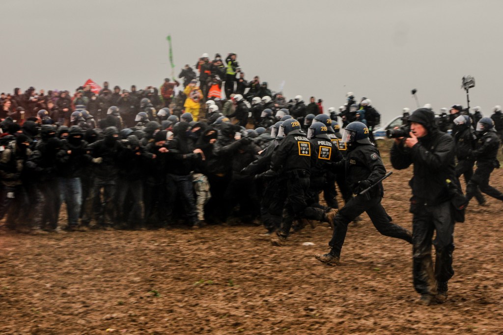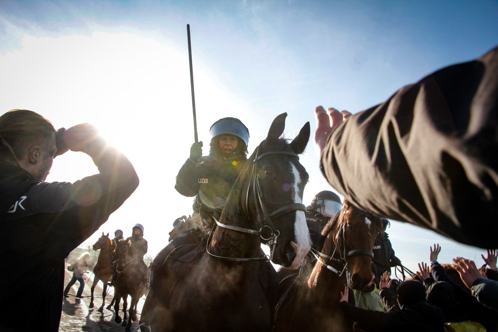 Le bras de fer s’est joué sur le terrain, violemment. Alors que des journalistes ont été blessés, harcelées sexuellement ou empêchées de couvrir certaines expulsions, les syndicats de presse allemands ont publié plusieurs communiqués cinglants à l’égard de la police. L’auteur du présent reportage a lui-même été gazé plusieurs fois au spray poivré, chargé par des chevaux, poussé dans la boue par un policier zélé, interdit d’accès à des opérations de police, et nassé avec des manifestants sans avoir le droit d’en sortir.