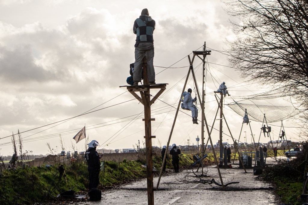Des milliers de policiers ont envahi le terrain en quelques heures mercredi 11 janvier, perforant les chaînes humaines, détruisant les barricades, et expulsant les activistes de leurs perchoirs, huttes, cabanes. Encerclant la ZAD de toutes les directions, les casques bleu et blanc ont pénétré dans la ZAD sans y croire eux-mêmes, un peu paumés au milieu des constructions farfelues faites de bric et de broc, d’un joyeux pêle-mêle d’amour et de débrouille. « On ne s’attendait pas à une intervention aussi massive et brutale », raconte « Magouille », un anarchiste francophone perché sur le toit d’un hangar de ferme en cours d’expulsion pendant qu’il lance de la boue sur les forces de police en contrebas.