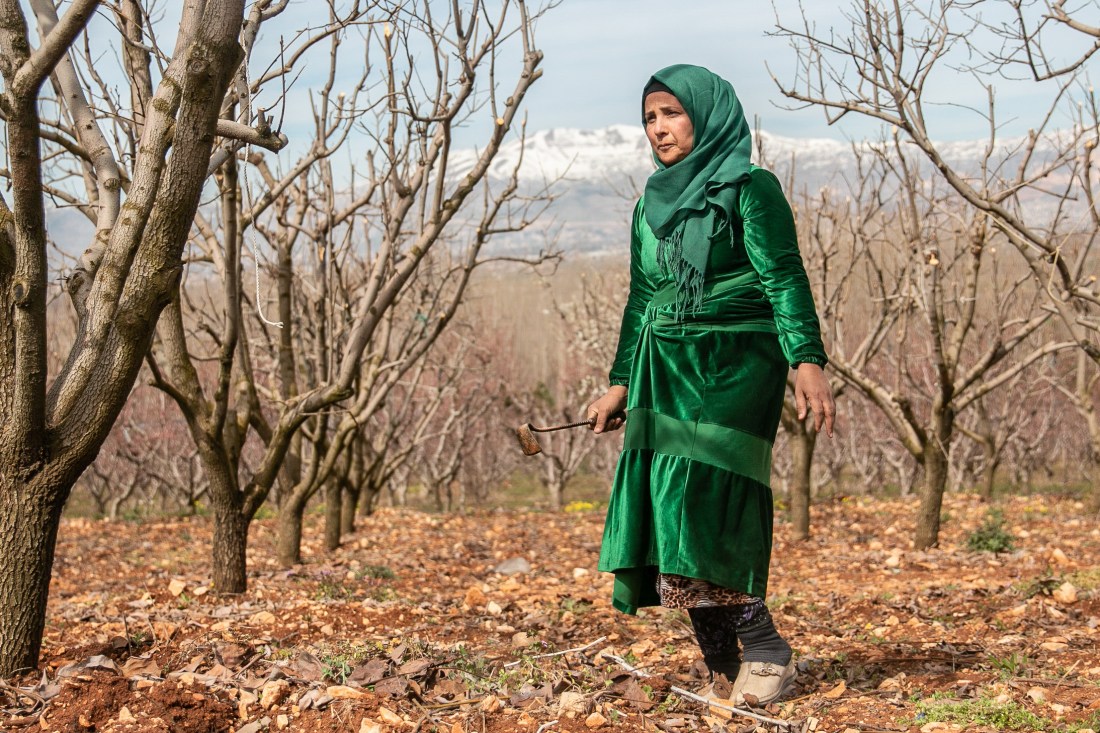 On this orchard close to the Bekaa valley town of Anjar, the still hibernating trees dance in the gentle breeze, overlooking the snowy mountains of Mount Lebanon. Khawla works here almost every day to provide for her family.