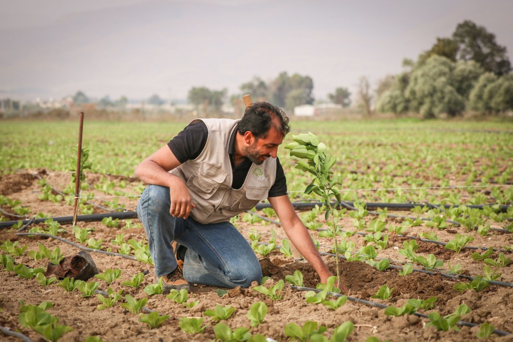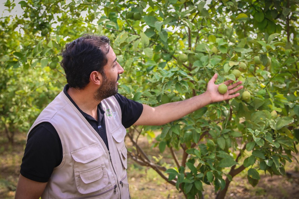 Aujourd’hui, Soleiman n’est pas seul dans sa lutte contre la sécheresse. Deux membres du Arab Group for the Protection of Nature (APN) l’aident à planter 350 jeunes citronniers, orangers et autres agrumes au milieu d’un champ de salades.