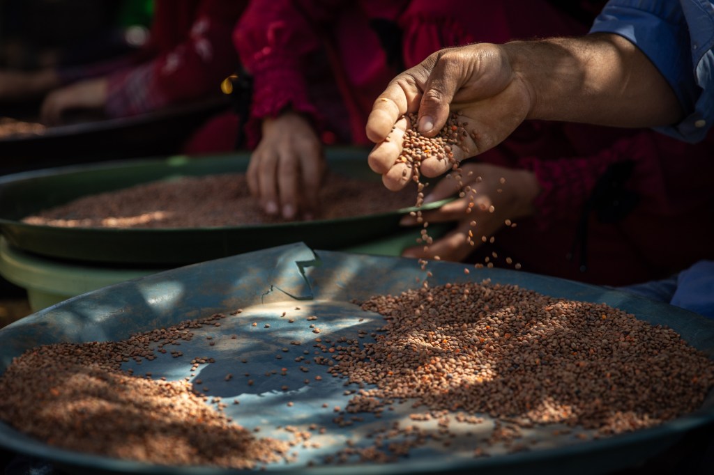 Walid, membre syrien de la communauté, et sa famille trient des grains de lentilles qui seront distribués aux cantines solidaires qui aident les personnes déplacées dans tout le Liban. © Philippe Pernot / Reporterre
