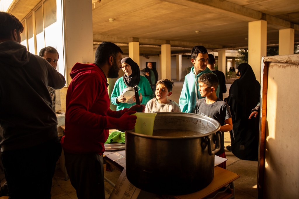Boxes of aid were stacked in the high school’s yard, while young volunteers carried them around, unpacked them, and served meals to the displaced. Many were students from the high school, volunteering while waiting for their classes to resume.