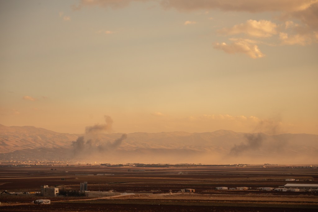 At sunset, the frightening roar of warplanes can be heard in the sky over the Lebanese town of Deir al-Ahmar. Black billows are seen over the horizon all around the village amid the setting sun’s golden rays, as Israel’s bombs strike — the sound of the pounding explosions startling children who can be heard screaming in fear.