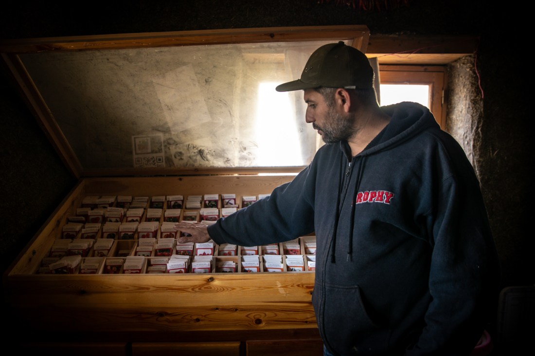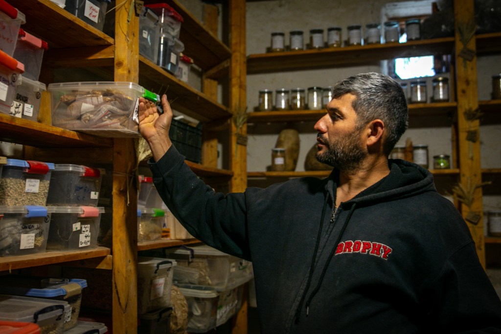 Youssef picks up a transparent plastic box filled to the brim with small bags of seeds.