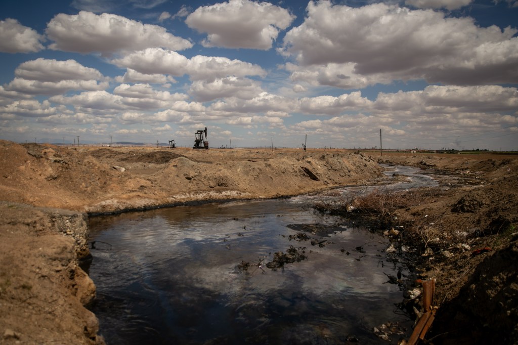 Une rivière noire serpente entre les terres arides de Kharab Abu Ghalib, dégageant une odeur nauséabonde de pétrole. Des puits de forage entourent le petit village de maisons en terre cuite et des cheminées industrielles laissent s’échapper une fumée inquiétante à l’horizon.