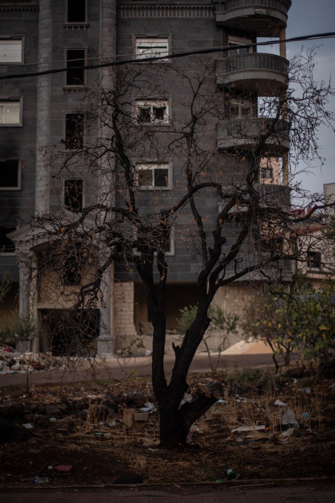 « Nos forêts ont été détruites à 95 % pendant la guerre, laissant un trou béant dans nos cœurs et notre identité. Elles étaient notre poumon, dit Essam. Les habitants ont coupé les arbres pour se chauffer ou revendre le bois, et l’armée d’Assad avait bétonné des routes pour faire passer ses tanks. »