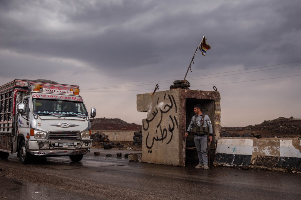 Mais pour arriver sur la montagne, il faut franchir des checkpoints, tenus d’abord par des hommes armés vêtus de noir — les forces de sécurité du nouveau gouvernement syrien —, puis par des miliciens druzes en tenues disparates.